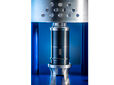 Ein Druckzylinder komprimiert den Prüfkörper, dabei wird die Höhe des Prüfkörpers gemessen und angezeigt.